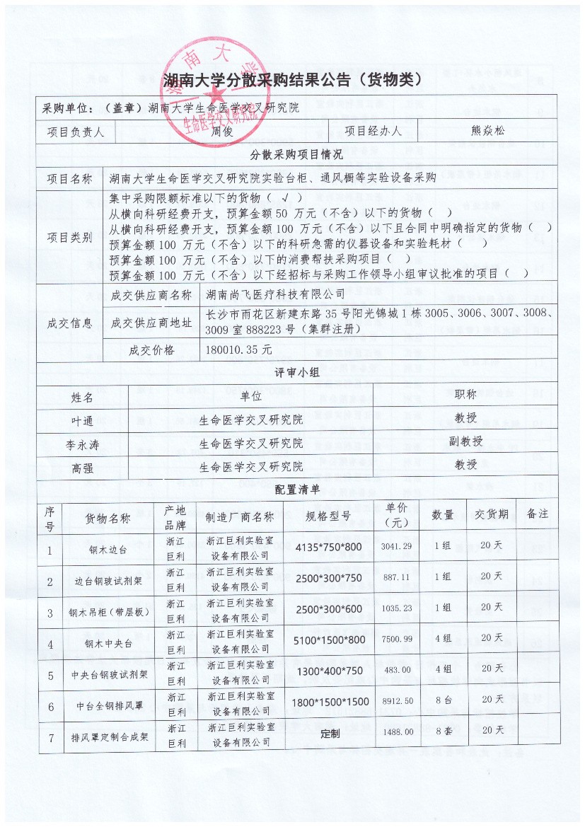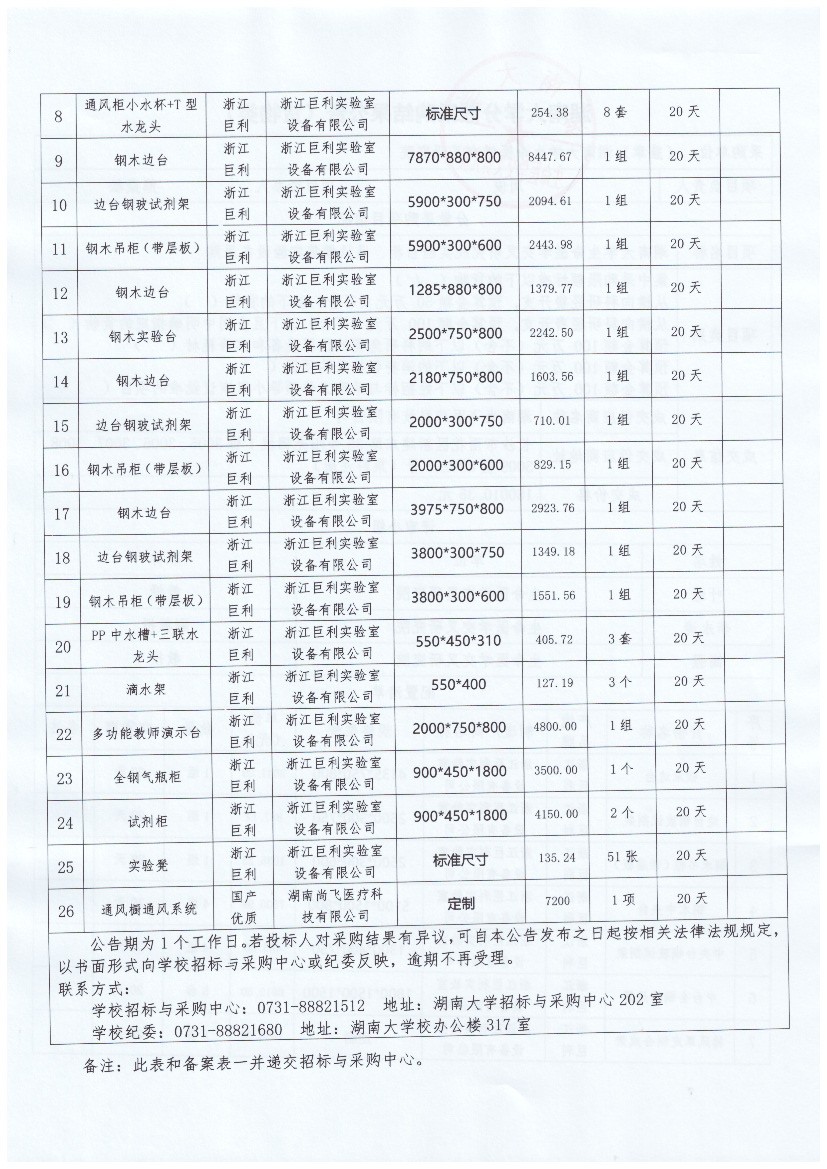 湖南大学实验台柜通风橱等实验设备分散采购结果公告